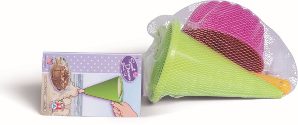 3dielna sada na piesok, vyrobená z kvalitných plastov v Taliansku. Obsahuje: 1 dekoratérsky lievik na miešanie piesku a vody a vytárenie kreatívnych muffinov a iných výtvorov, 1 tvorítko v tvare bábovky, 1 kopčekovač na zmrzlinu. Balené v sieťke s rozmermi 11 x 18x 17 cm. Váha: 0,122 kg. Odporúčaný vek od 10 mesiacov.