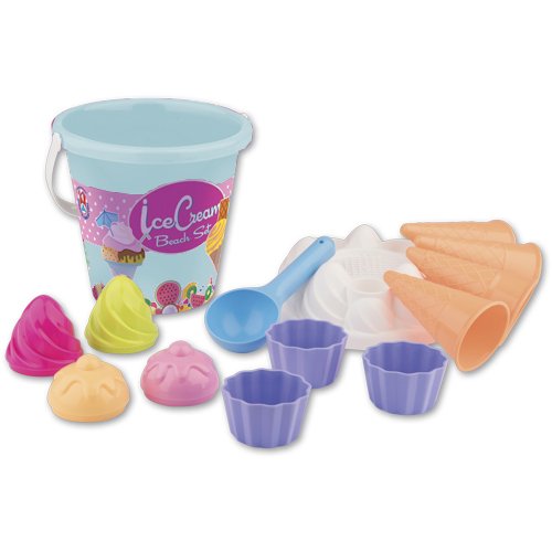14dielna sada na piesok, vyrobená z kvalitných plastov v Taliansku. Obsahuje: vedierko, sitko v podobe zmrzlinového pohára, kopčekovač na zmrzlinu, 4 čiapočky zmrzlín, 4 zmrzlinové kornúty a 3 misky. Vedierko: priemer 17 cm, výška 16 cm. Súprava: výška 31 cm, váha 0,47 kg. Odporúčaný vek od 12 mesiacov.