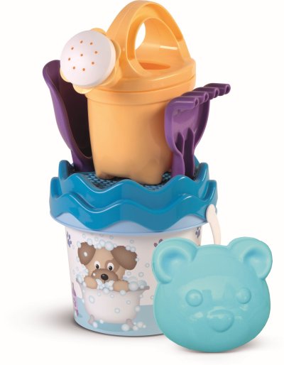 6dielna sada na piesok, vyrobená z kvalitných plastov v Taliansku. Obsahuje: vedierko, kanvičku 0,5 l, sitko, lopatku, hrabličky a tvorítko v tvare psej hlavy. Vedierko: priemer 13 cm, výška 11 cm. Súprava: výška 29 cm, váha 0,251 kg. Odporúčaný vek od 10 mesiacov.