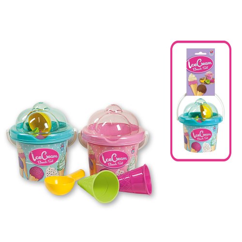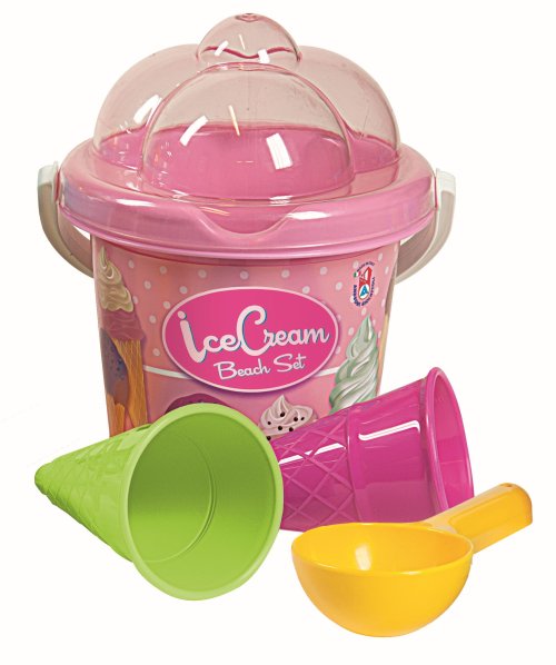 5dielna sada na piesok, vyrobená z kvalitných plastov v Taliansku. Obsahuje: vedierko s vekom v tvare zmrzlinového pohára, kopčekovač na zmrzlinu a 2 zmrzlinové kornútky. Vedierko: priemer 13 cm, výška 11 cm. Súprava: výška 16 cm, váha 0,26 kg. Odporúčaný vek od 10 mesiacov.