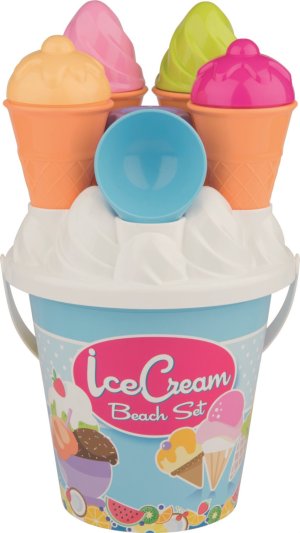 Súprava obsahuje: kýblik s viečkom, naberačku a formičky (11 ks) v tvare zmrzlinových kornútov a kopčekov.
