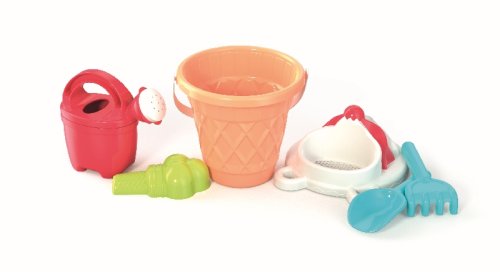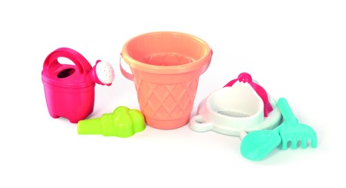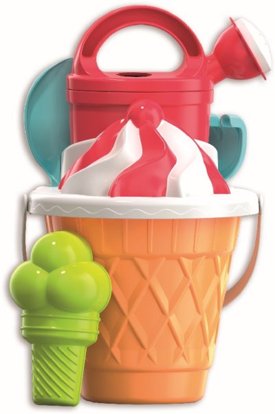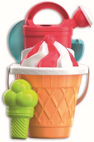 6dielna sada na piesok, vyrobená z kvalitných plastov v Taliansku. Obsahuje: vedierko v štýle kornútku, sitko v podobe točenej zmrzliny, tvorítko v tvare zmrzliny s 3 kopčekmi, kanvičku, lopatku a hrabličky. Vedierko: priemer 17 cm, výška 16 cm. Súprava: výška 30 cm, váha 0,42 kg. Odporúčaný vek od 12 mesiacov.