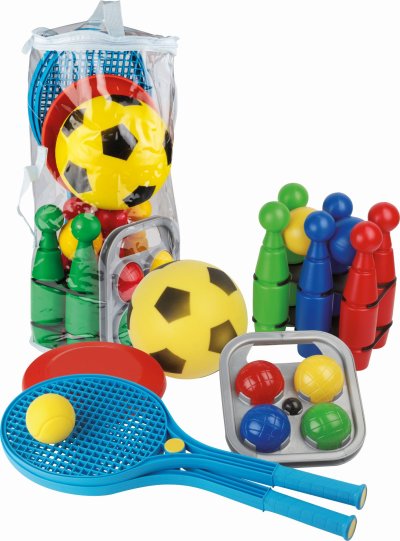 Športová sada, vyrobená z kvalitných plastov v Taliansku. Obsahuje: mäkkú loptu priemer 20 cm, sadu na lenivý tenis s loptičkou (veľkosť rakety 54 cm, priemer 21 cm), petanque, frisbee priemer 22 cm a sadu 6 kolkov s dvoma loptičkami. Všetko je uložené v praktickom batohu so zipsom. Rozmery balenia: 31 x 31 x 38 cm (dx š xv). Váha sady: 1,8 kg. Odporúčaný vek od 36 mesiacov.