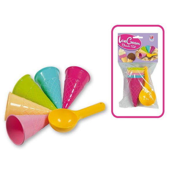 6dielna sada tvorítok na piesok - zmrzlina. Vyrobené v Taliansku z kvalitných plastov. Obsahuje päť kornútkov a kopčekovač na zmrzlinu. Balené v sáčku s rozmermi 15 x 31 cm. Váha: 0,17 kg. Váha: 0,14 kg. Odporúčaný vek od 12 mesiacov.