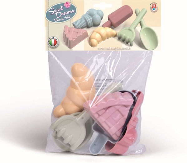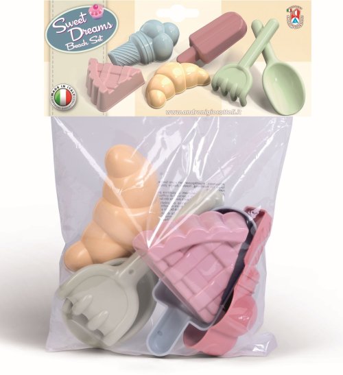6dielna sada tvorítok na piesok - cukráreň. Vyrobené v Taliansku z kvalitných plastov. Obsahuje: Hrabličky, lopatku a formičky: nanuk, zmrzlina, torta a croissant. Balené v sáčku s rozmermi 23 x 31 cm. Váha: 0,17 kg. Odporúčaný vek od 10 mesiacov.
