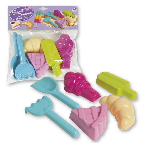 6dielna sada tvorítok na piesok - cukráreň. Vyrobené v Taliansku z kvalitných plastov. Obsahuje: Hrabličky, lopatku a formičky: nanuk, zmrzlina, torta a croissant. Balené v sáčku s rozmermi 23 x 31 cm. Váha: 0,17 kg. Odporúčaný vek od 12 mesiacov.