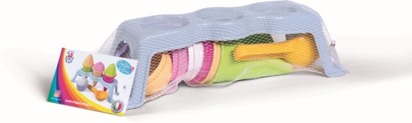 10dielna sada tvorítok na piesok - zmrzlina v stojane. Vyrobené v Taliansku z kvalitných plastov. Obsahuje tri kornútky so zmrzlinou, jedno tvorítko na tortu s tortkou, kopčekovač na zmrzlinu a stojan. Balené v sieťke s rozmermi 9,5 cm x 29 cm x 17 cm (š xdxv). Váha: 0,153 kg. Odporúčaný vek od 10 mesiacov.