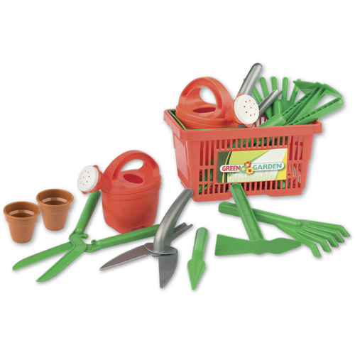 9dielna sada záhradníckeho náradia v praktickom košíku pre malých záhradníkov, vyrobená z kvalitných plastov v Taliansku. Set obsahuje: Košík s rukoväťou, kanvičku 0,5 litra, 2 malé záhradné hrantíky, dva druhy záhradných nožníc, jamku, motyčku a hrabličky. Súprava: 23 x 16 x 23 cm (dx š xv), váha 0,45 kg. Odporúčaný vek od 12 mesiacov.