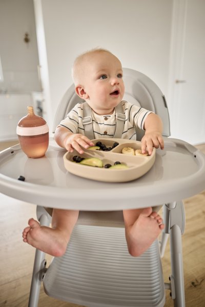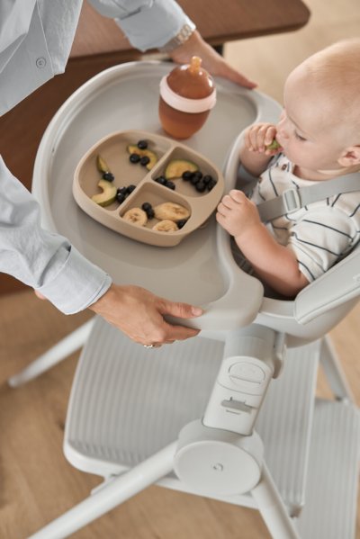 Odnímateľný podnos - jedálenská stolička obsahuje nastaviteľnú jedálenskú tácku s dvoma polohami a odnímateľným krytom pre ľahké čistenie.