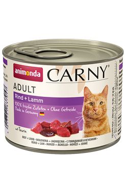 Konzerva s hovädzím a jahňacím mäsom. Kompletné krmivo pre dospelé mačky.