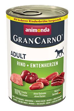 Animonda GranCarno Adult optimálne vyvážené a chutné krmivo pre dospelého psa vo veku 1–6 rokov vyrobené výhradne z čerstvého mäsa a vnútorností vynikajúca masová chuť bez obilnín a sóje bez farbív a konzervačných látok zloženie: 56% hovädzie (mäso, srdce, obličky, pľúca, pečeň, vemeno), 12% kačacie srdce, uhličitan vápenatý, chlorid sodný analytické zložky: proteín 11 %, obsah tuku 8,5 %, vláknina 0,5 %, popol 1,8 %, vlhkosť 77 % nutričné doplnkové látky (kg): vitamín D3200 oi, E2 0,2 mg, E5 1,5 mg, E6 10 mg hmotnosť: 400 g