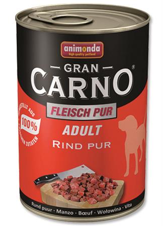 Animonda GranCarno Adult optimálne vyvážené a chutné krmivo pre dospelého psa vo veku 1–6 rokov vyrobené výhradne z čerstvého mäsa a vnútorností vynikajúca masová chuť bez obilnín a sóje bez farbív a konzervačných látok zloženie: 68% hovädzie mäso (srdce, pľúca, mäso, pečeň, vemeno, bachor, obličky), uličitan vápenatý, chlorid sodný analytické zložky: bielkoviny 11 %, tuk 8,5 %, vláknina 0,5 %, popol 1,8 %, vlhkosť 77 % nutričné doplnkové látky (kg): vitamín D3 200 IU, E2 0,2 mg, E5 1,5 mg, E6 10 mg hmotnosť: 400 g