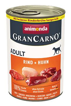 Animonda GranCarno Adult optimálne vyvážené a chutné krmivo pre dospelého psa vo veku 1–6 rokov vyrobené výhradne z čerstvého mäsa a vnútorností vynikajúca masová chuť bez obilnín a sóje bez farbív a konzervačných látok zloženie: 38% hovädzie mäso (pľúca, mäso, srdce, pečeň, obličky, vemeno), 30% kuracie (mäso, pečeň, žalúdok, krk), uhličitan vápenatý, chlorid sodný analytické zložky: proteín 11 %, obsah tuku 8,5 %, vláknina 0,5 %, popol 1,8 %, vlhkosť 77 % nutričné doplnkové látky (kg): vitamín D3200 oi, E2 0,2 mg, E5 1,5 mg, E6 10 mg hmotnosť: 400 g