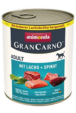Animonda GranCarno Adult optimálne vyvážené a chutné krmivo pre dospelého psa vo veku 1–6 rokov vyrobené z čerstvého mäsa a vnútorností - s viditeľnými mäsovými kúskami vynikajúca masová chuť - nefalšovaný pôžitok bez obilnín, bez lepku, bez sóje, bez cukru bez umelých farbív a konzervačných látok pečeň, pľúca, mäso), 29 % vývar z lososa, 12 % losos, 4 % špenát, minerálne látky, požltový olejAnalytické zložky: proteín 10,5 %, obsah tuku 5 %, vláknina 0,4 %, popol 2,5 %, vlhkosť 79 % monohydrát síranu manganatého, 25 mg síranu zinočnatého, monohydrátu, 0,5 mg síranu meďnatého(II) pentahydrátuHmotnosť: 800 g