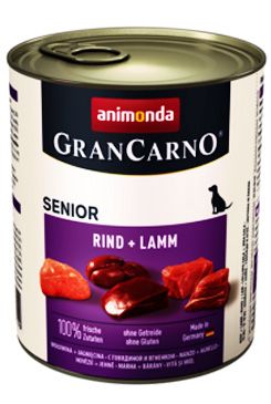 Animonda GranCarno Senior kompletné krmivo pre staršie psy od 7 rokov veku vyrobené výhradne z čerstvého mäsa a vnútorností vynikajúca masová chuť bez obilnín a sóje bez farbív a konzervačných látok zloženie: 43% hovädzie mäso (pľúca, mäso, srdce, vemeno, obličky), 25% jahňacia pečeň, držky), uhličitan vápenatý, 0,2% lososový olej, chlorid sodný analytické zložky: proteín 10,5 %, obsah tuku 8 %, vláknina 0,4 %, popol 2 %, vlhkosť 77,5 %. nutričné doplnkové látky (kg): vitamín D3 200 IU, E2 0,2 mg, E5 1,5 mg, E6 10 mg hmotnosť: 800 g