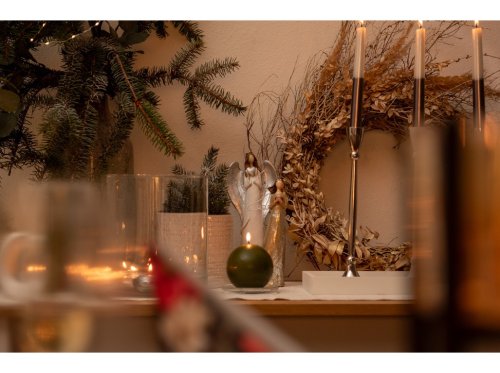 Tento dekoratívny anjelik z polyresinu v bielej farbe so zlatými doplnkami rozžiari váš domov jemným teplom sviatočnej atmosféry. Je ideálny ako vianočné dekorácie. Zlaté detaily dodávajú figúrke slávnostný vzhľad a ľahko ju zladíte s ostatnými vianočnými ozdobami.