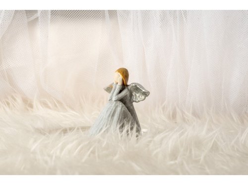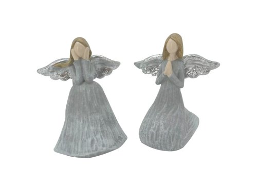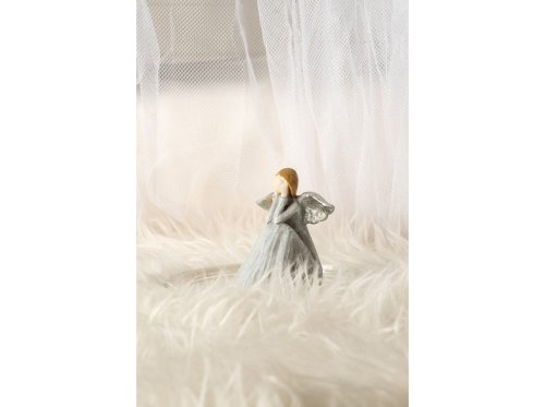 Dekoračný anjelik z polyresinu o rozmere 75×70×85 mm v jemnom šedom a striebornom prevedení. Farebné varianty sú dodávané v mixe, jednotlivé kusy sa môžu líšiť odtieňom aj drobnými detailmi.