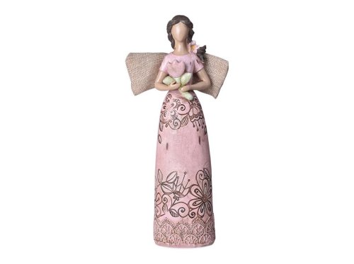 Tento jarne naladený anjelik nesúci kvet je vyrobený z polyresinu, je sfarbený do ružovej farby a má krásne zdobené šaty so vzorom kvetov. Anjelik má rozmery 80x300mm a je opatrený jemnými detailmi, ktoré mu dodávajú vierohodný vzhľad. Môžete ho umiestniť na stôl, komodu alebo krbovú rímsu, kde zaručene upúta pozornosť a stane sa ozdobou vášho interiéru.