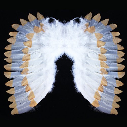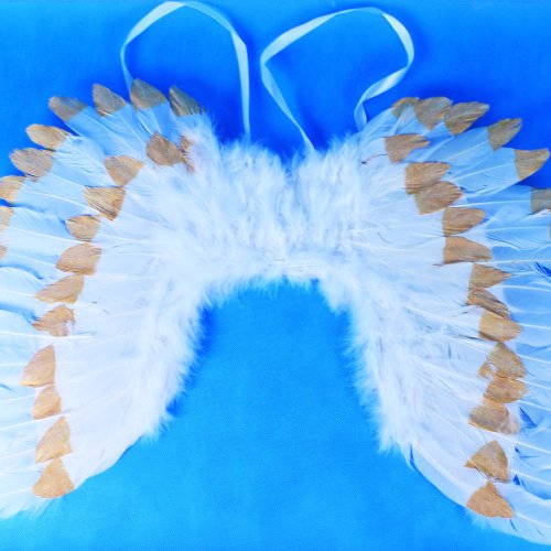 Prekrásne krídla pre skutočných anjelov so snehovo bielym perím zdobeným zlatými trblietkami! Tieto nebeské krídla sú skvelým doplnkom k anjelskému kostýmu. Rozmer krídiel po rozložení je cca 67 x 46 cm.