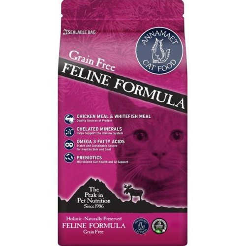 Annamaet Grain Free Feline je receptúra vyrábaná úplne bez použitia obilnín, verná mäsožravému pôvodu mačiek. Vyrába sa z bielych morských rýb z voľného oceánu a kurčiat chovaných bez použitia antibiotík a hormónov. Vďaka tomu obsahuje veľké množstvo kvalitných bielkovín a tukov. Krmivo je určené pre mačky vo všetkých životných štádiách.