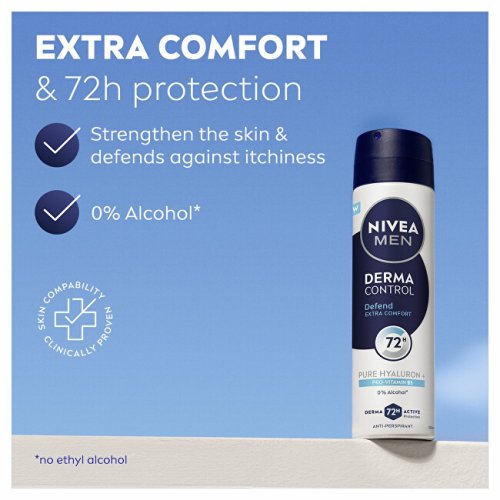 Objavte spoľahlivý antiperspirant, ktorý vám zaistí účinnú ochranu pred potom a zápachom až na 72 hodín. Vďaka inovatívnemu zloženiu s kyselinou hyalurónovou a provitamínom B5 sa zároveň stará o pokožku podpazušia. Vyskúšajte sprej antiperspirant pre mužov Derma Control Defend.