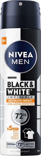 Antiperspirant v spreji Men Invisible Black & White Ultimate Impact vás ochráni pred potom a pachom až na 72 hodín. Zaistí vám dlhotrvajúcu účinnosť proti zápachu, potu, škvrnám, podráždeniu a pozostatkom antiperspirantu. Chráni pokožku a oblečenie pred potom, bielymi stopami a žltými škvrnami.