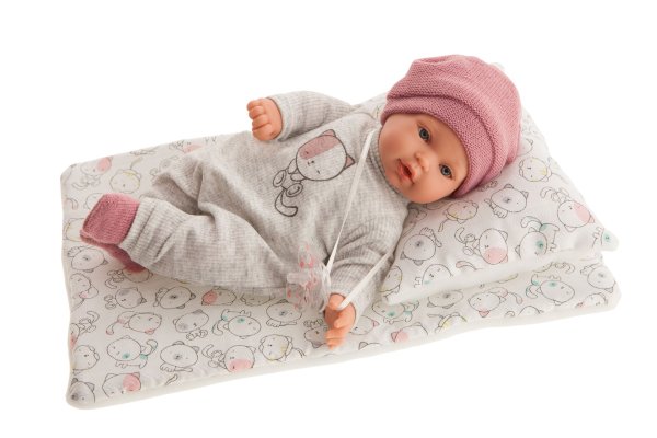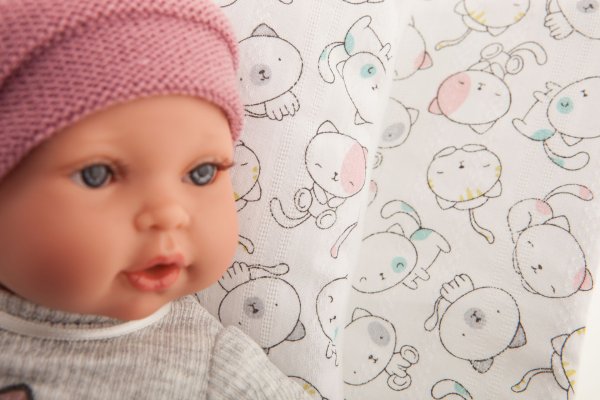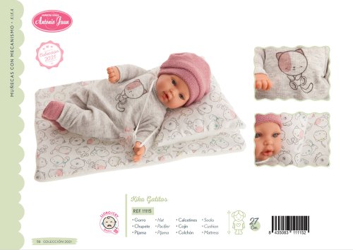 Plačúca, ručne vyrobená realistická španielska bábika, reagujúca na magnetický cumlík. Po vytiahnutí cumlíka z úst vydáva reálny zvuk plačúceho dieťaťa, ktorý je možné utíšiť opäť cumlíkom. Bábika má mäkké látkové telo, hlava a končatiny sú vyrobené z kvalitného mäkčeného vinylu. Oblečenie niektorých bábik bolo vyrobené z organickej bavlny, ktorá zaručuje výrobu z ručne zbieranej, ekologicky bez chemického ošetrenia pestovanej bavlny. Firma Antonio Juan kladie veľký dôraz na ekológiu a preto ako prvá využíva v tomto odvetví spomínanú bavlnu. Veľkosť 27 cm. Balené v darčekovej krabici. Odporúčaný vek od 3 rokov. Súčasťou balenia je 3 x gombíková batéria LR44 s návodom na jej výmenu. Batérie sú spotrebný tovar a preto ich vybitie nie je dôvodom na reklamáciu bábiky.