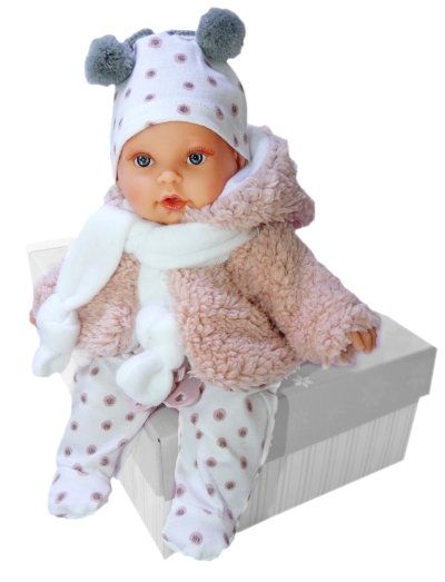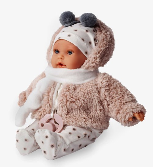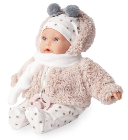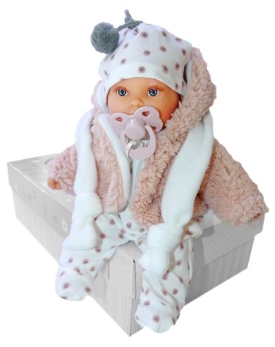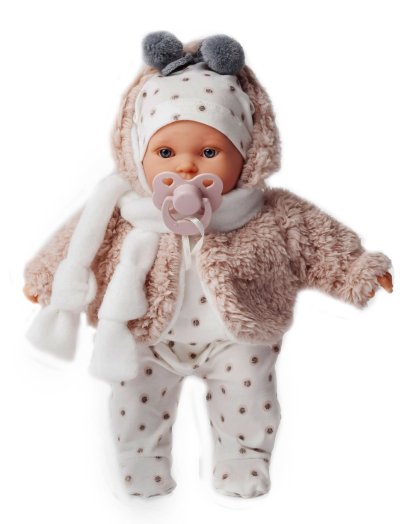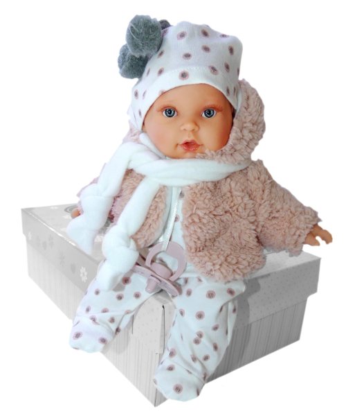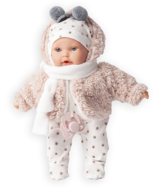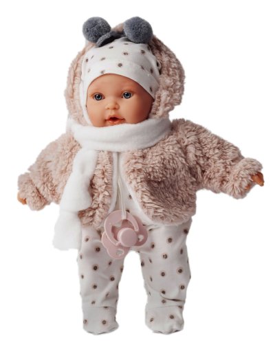 Plačúca a hovoriaca, ručne vyrobená realistická španielska bábika, reagujúca na magnetický cumlík. Po vytiahnutí cumlíka z úst vydáva reálny zvuk plačúceho dieťaťa, ktorý je možné utíšiť opäť cumlíkom a hovorí „mama“, „papa“. Bábika má mäkké látkové telo, hlava a končatiny sú vyrobené z kvalitného mäkčeného vinylu. Oblečenie niektorých bábik bolo vyrobené z organickej bavlny, ktorá zaručuje výrobu z ručne zbieranej, ekologicky bez chemického ošetrenia pestovanej bavlny. Firma Antonio Juan kladie veľký dôraz na ekológiu a preto ako prvá využíva v tomto odvetví spomínanú bavlnu. Veľkosť 27 cm. Balené v darčekovej krabici. Odporúčaný vek od 2 rokov. Súčasťou balenia je 3 x gombíková batéria LR44 s návodom na jej výmenu. Batérie sú spotrebný tovar a preto ich vybitie nie je dôvodom na reklamáciu bábiky.