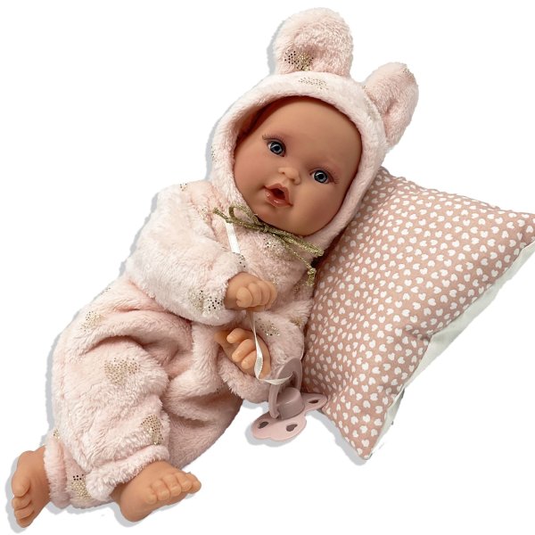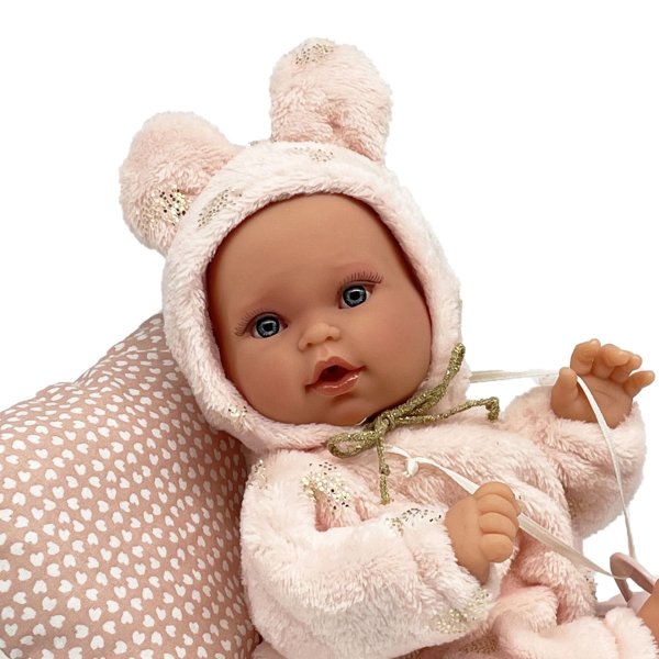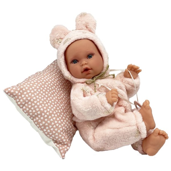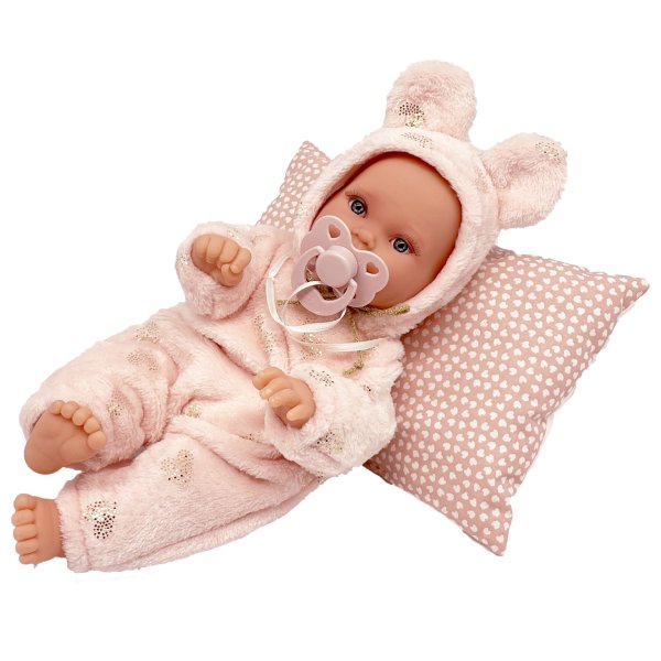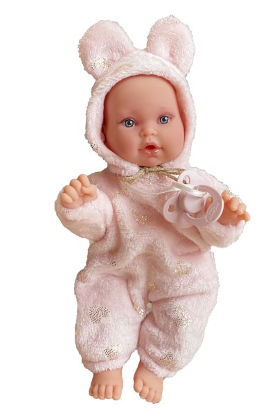 Ručne vyrobená realistická španielska bábika - bábätko, so špeciálnou pohybovou funkciou. Vďaka vnútornej opore kostry tela, môže robiť neobvyklé pohyby končatín, ako prekrížiť nožičky v ľahu, dať k sebe dlane alebo zaujať rôzne bábätkovské polohy. Bábätko má mäkké látkové telo, hlava a končatiny sú vyrobené z kvalitného mäkčeného vinylu. Oblečenie niektorých bábik bolo vyrobené z organickej bavlny, ktorá zaručuje výrobu z ručne zbieranej, ekologicky bez chemického ošetrenia pestovanej bavlny. Firma Antonio Juan kladie veľký dôraz na ekológiu a preto ako prvá využíva v tomto odvetví spomínanú bavlnu. Veľkosť 27 cm. Balené v darčekovej krabici. Odporúčaný vek od 3 rokov.