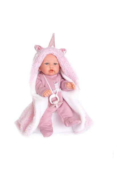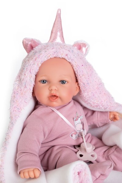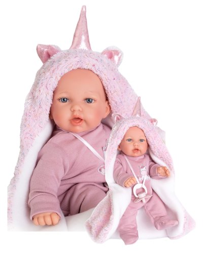 Hovoriaca, ručne vyrobená realistická španielska bábika. Po zatlačení na bruško začne bábika hovoriť „mama“, „papa“ a vydávať reálny zvuk smejúceho sa dieťaťa. Bábika má mäkké látkové telo, hlava a končatiny sú vyrobené z kvalitného mäkčeného vinylu. Oblečenie niektorých bábik bolo vyrobené z organickej bavlny, ktorá zaručuje výrobu z ručne zbieranej, ekologicky bez chemického ošetrenia pestovanej bavlny. Firma Antonio Juan kladie veľký dôraz na ekológiu a preto ako prvá využíva v tomto odvetví spomínanú bavlnu. Veľkosť 27 cm. Balené v darčekovej krabici. Odporúčaný vek od 3 rokov. Súčasťou balenia je 3 x gombíková batéria LR44 s návodom na jej výmenu. Batérie sú spotrebný tovar a preto ich vybitie nie je dôvodom na reklamáciu bábiky.
