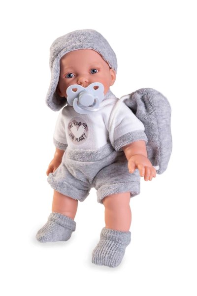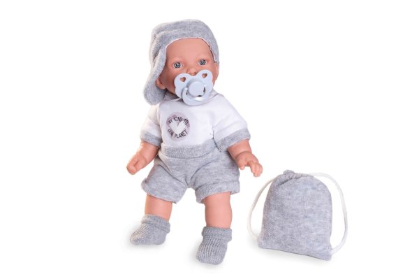 Hovoriaca, ručne vyrobená realistická španielska bábika. Po zatlačení na bruško začne bábika hovoriť „mama“, „papa“ a vydávať reálny zvuk smejúceho sa dieťaťa. Bábika má mäkké látkové telo, hlava a končatiny sú vyrobené z kvalitného mäkčeného vinylu. Oblečenie niektorých bábik bolo vyrobené z organickej bavlny, ktorá zaručuje výrobu z ručne zbieranej, ekologicky bez chemického ošetrenia pestovanej bavlny. Firma Antonio Juan kladie veľký dôraz na ekológiu a preto ako prvá využíva v tomto odvetví spomínanú bavlnu. Veľkosť 27 cm. Balené v darčekovej krabici. Odporúčaný vek od 2 rokov. Súčasťou balenia je 3 x gombíková batéria LR44 s návodom na jej výmenu. Batérie sú spotrebný tovar a preto ich vybitie nie je dôvodom na reklamáciu bábiky.