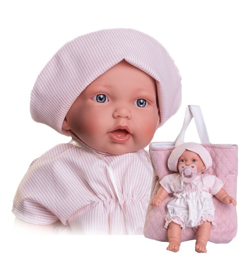 Hovoriaca, ručne vyrobená realistická španielska bábika. Po zatlačení na bruško začne bábika hovoriť „mama“, „papa“ a vydávať reálny zvuk smejúceho sa dieťaťa. Bábika má mäkké látkové telo, hlava a končatiny sú vyrobené z kvalitného mäkčeného vinylu. Oblečenie niektorých bábik bolo vyrobené z organickej bavlny, ktorá zaručuje výrobu z ručne zbieranej, ekologicky bez chemického ošetrenia pestovanej bavlny. Firma Antonio Juan kladie veľký dôraz na ekológiu a preto ako prvá využíva v tomto odvetví spomínanú bavlnu. Veľkosť 27 cm. Balené v darčekovej krabici. Odporúčaný vek od 2 rokov. Súčasťou balenia je 3 x gombíková batéria LR44 s návodom na jej výmenu. Batérie sú spotrebný tovar a preto ich vybitie nie je dôvodom na reklamáciu bábiky.