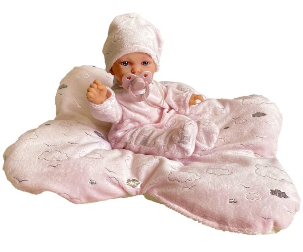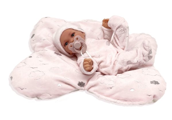 Ručne vyrobená realistická španielska bábika - bábätko, so špeciálnou pohybovou funkciou. Vďaka vnútornej opore kostry tela, môže robiť neobvyklé pohyby končatín, ako prekrížiť nožičky v ľahu, dať k sebe dlane alebo zaujať rôzne bábätkovské polohy. Bábätko má mäkké látkové telo, hlava a končatiny sú vyrobené z kvalitného mäkčeného vinylu. Oblečenie niektorých bábik bolo vyrobené z organickej bavlny, ktorá zaručuje výrobu z ručne zbieranej, ekologicky bez chemického ošetrenia pestovanej bavlny. Firma Antonio Juan kladie veľký dôraz na ekológiu a preto ako prvá využíva v tomto odvetví spomínanú bavlnu. Veľkosť 27 cm. Balené v darčekovej krabici. Odporúčaný vek od 3 rokov.