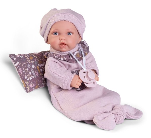 Ručne vyrobená realistická španielska bábika s mäkkým látkovým telom. Hlava a končatiny sú vyrobené z kvalitného mäkčeného vinylu. Oblečenie niektorých bábik bolo vyrobené z organickej bavlny, ktorá zaručuje výrobu z ručne zbieranej, ekologicky bez chemického ošetrenia pestovanej bavlny. Firma Antonio Juan kladie veľký dôraz na ekológiu a preto ako prvá využíva v tomto odvetví spomínanú bavlnu. Veľkosť 27 cm. Balené v darčekovej krabici. Odporúčaný vek od 2 rokov.