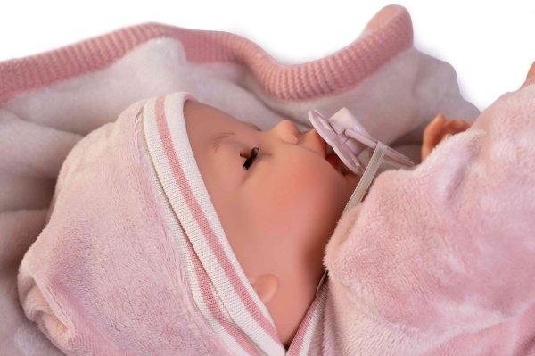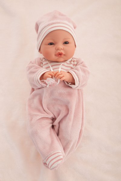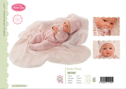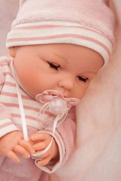 Mrkacie a plačúce, ručne vyrobená španielska bábika - bábätko, reagujúce na magnetický cumlík. Po vytiahnutí cumlíka z úst začne bábika hovoriť „mama“, „papa“ a vydávať reálny zvuk plačúceho dieťaťa, ktorý je možné utíšiť cumlíkom. Bábika má mäkké látkové telo, hlava a končatiny sú vyrobené z kvalitného mäkčeného vinylu. Oblečenie niektorých bábik bolo vyrobené z organickej bavlny, ktorá zaručuje výrobu z ručne zbieranej, ekologicky bez chemického ošetrenia pestovanej bavlny. Firma Antonio Juan kladie veľký dôraz na ekológiu a preto ako prvá využíva v tomto odvetví spomínanú bavlnu. Veľkosť 37 cm. Balené v darčekovej krabici. Odporúčaný vek od 3 rokov. Súčasťou balenia je 3 x gombíková batéria LR44 s návodom na jej výmenu. Batérie sú spotrebný tovar a preto ich vybitie nie je dôvodom na reklamáciu bábiky.