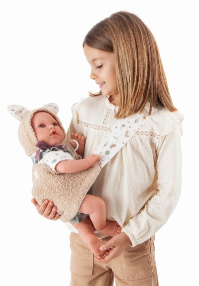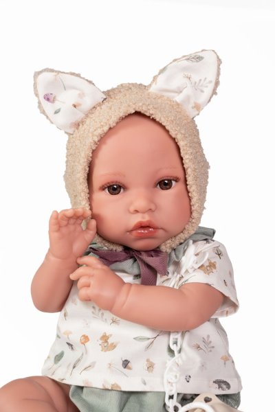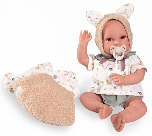 Ručne vyrobená realistická španielska bábika - bábätko s realistickými prvkami na tvári a na končatinách. Ruky a nohy sú k telu prichytené kĺbom s možnosťou polohovania, čo bábätku umožňuje napríklad aj samostatné sedenie bez opory. Bábika má mäkké látkové telo, hlava a končatiny sú vyrobené zo špeciálneho mäkčeného vinylu, príjemného na dotyk. Oblečenie niektorých bábik bolo vyrobené z organickej bavlny, ktorá zaručuje výrobu z ručne zbieranej, ekologicky bez chemického ošetrenia pestovanej bavlny. Firma Antonio Juan kladie veľký dôraz na ekológiu a preto ako prvá využíva v tomto odvetví spomínanú bavlnu. Veľkosť 42 cm. Balené v darčekovej krabici. Odporúčaný vek od 3 rokov.