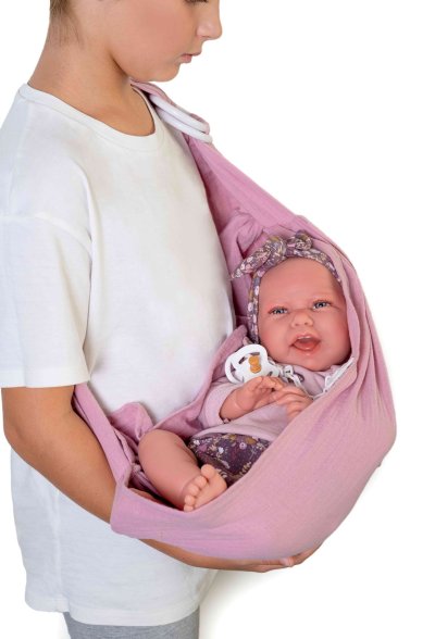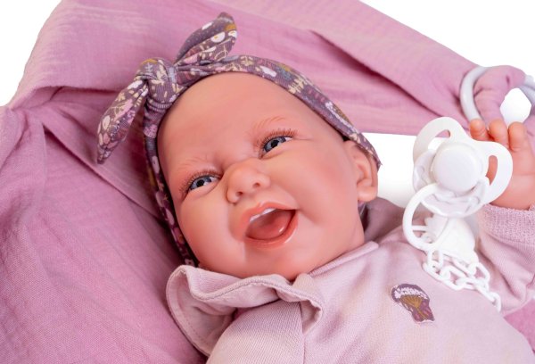 Ručne vyrobená realistická španielska bábika - bábätko s realistickými prvkami na tvári a na končatinách. Ruky a nohy sú k telu prichytené kĺbom s možnosťou polohovania, čo bábätku umožňuje napríklad aj samostatné sedenie bez opory. Bábika má mäkké látkové telo, hlava a končatiny sú vyrobené zo špeciálneho mäkčeného vinylu, príjemného na dotyk. Oblečenie niektorých bábik bolo vyrobené z organickej bavlny, ktorá zaručuje výrobu z ručne zbieranej, ekologicky bez chemického ošetrenia pestovanej bavlny. Firma Antonio Juan kladie veľký dôraz na ekológiu a preto ako prvá využíva v tomto odvetví spomínanú bavlnu. Veľkosť 42 cm. Balené v darčekovej krabici. Odporúčaný vek od 3 rokov.