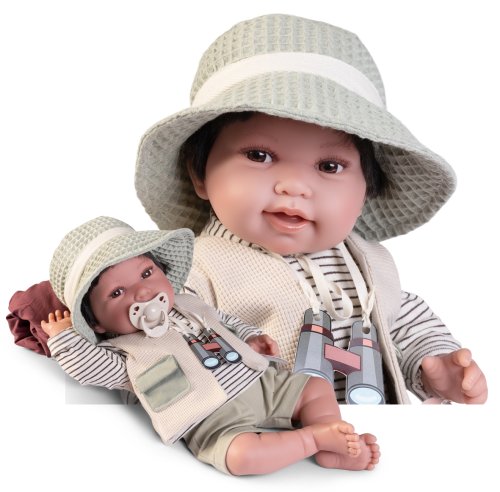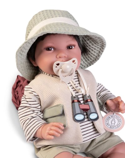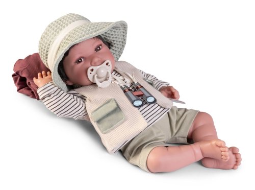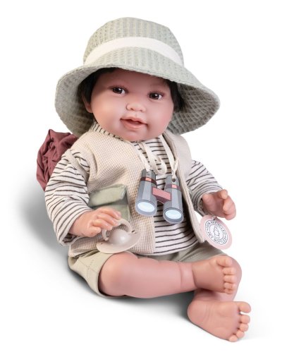 Ručne vyrobená realistická španielska bábika - bábätko s realistickými prvkami na tvári a na končatinách. Ruky a nohy sú k telu prichytené kĺbom s možnosťou polohovania, čo bábätku umožňuje napríklad aj samostatné sedenie bez opory. Bábika má mäkké látkové telo, hlava a končatiny sú vyrobené zo špeciálneho mäkčeného vinylu, príjemného na dotyk. Oblečenie niektorých bábik bolo vyrobené z organickej bavlny, ktorá zaručuje výrobu z ručne zbieranej, ekologicky bez chemického ošetrenia pestovanej bavlny. Firma Antonio Juan kladie veľký dôraz na ekológiu a preto ako prvá využíva v tomto odvetví spomínanú bavlnu. Veľkosť 42 cm. Balené v darčekovej krabici. Odporúčaný vek od 3 rokov.