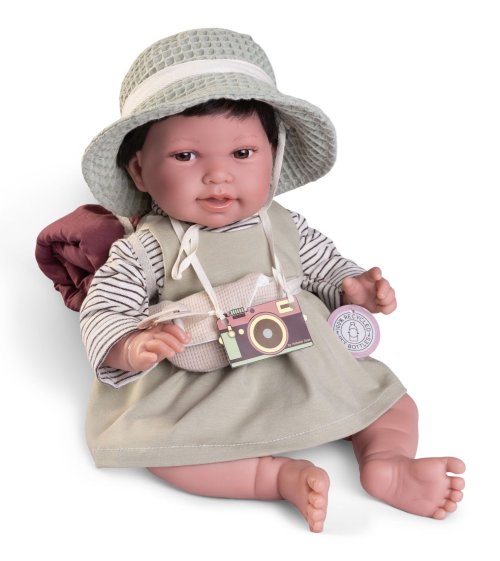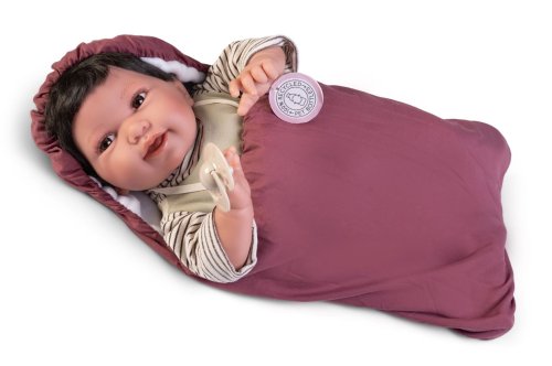 Ručne vyrobená realistická španielska bábika - bábätko s realistickými prvkami na tvári a na končatinách. Ruky a nohy sú k telu prichytené kĺbom s možnosťou polohovania, čo bábätku umožňuje napríklad aj samostatné sedenie bez opory. Bábika má mäkké látkové telo, hlava a končatiny sú vyrobené zo špeciálneho mäkčeného vinylu, príjemného na dotyk. Oblečenie niektorých bábik bolo vyrobené z organickej bavlny, ktorá zaručuje výrobu z ručne zbieranej, ekologicky bez chemického ošetrenia pestovanej bavlny. Firma Antonio Juan kladie veľký dôraz na ekológiu a preto ako prvá využíva v tomto odvetví spomínanú bavlnu. Veľkosť 42 cm. Balené v darčekovej krabici. Odporúčaný vek od 3 rokov.