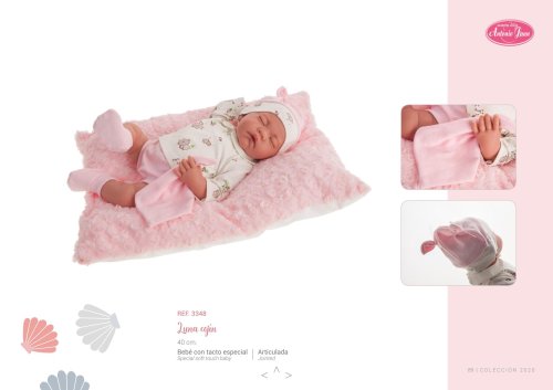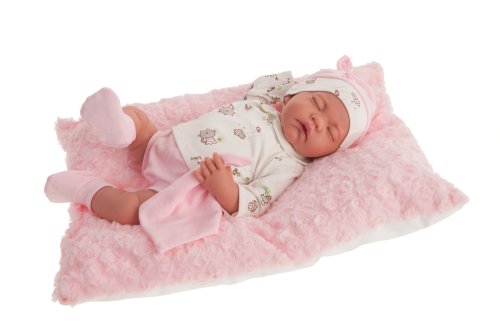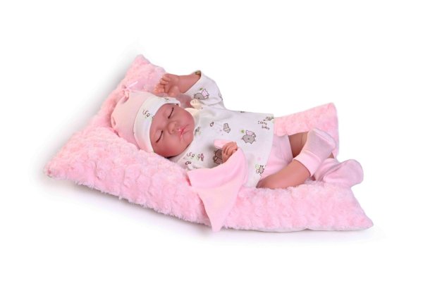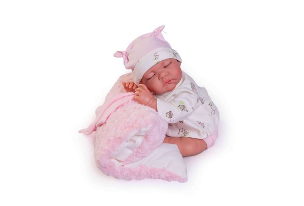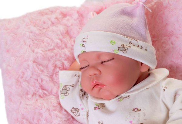Spiaca, ručne vyrobená realistická španielska bábika - bábätko s realistickými prvkami v tvári a na končatinách. Ruky a nohy sú k telu prichytené kĺbom s možnosťou polohovania, čo bábätku umožňuje dať si v spánku napríklad ručičky za hlavu. Bábika má mäkké látkové telo, hlava a končatiny sú vyrobené zo špeciálneho mäkčeného vinylu, príjemného na dotyk. Oblečenie bolo vyrobené z organickej bavlny, ktorá zaručuje výrobu z ručne zbieranej, ekologicky bez chemického ošetrenia pestovanej bavlny. Firma Antonio Juan kladie veľký dôraz na ekológiu a preto ako prvá využíva v tomto odvetví spomínanú bavlnu. Veľkosť 42 cm. Balené v darčekovej krabici. Odporúčaný vek od 3 rokov.