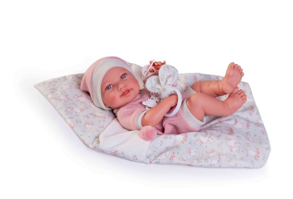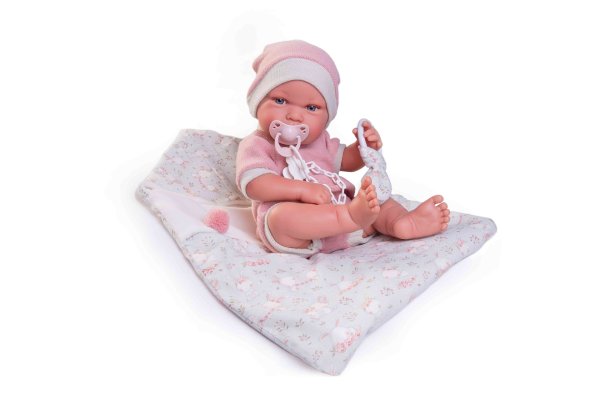 Ručne vyrobená realistická španielska bábika - bábätko new born s celovinylovým telom a realistickým vyobrazením rôznych bábätkovských faldíkov a detailov vrátane pohlavia. Bábika je vyrobená zo špeciálneho mäkčeného vinylu, veľmi príjemného na dotyk. Bábätko sa dá kúpať, ale je potrebné dať pozor, aby sa nenamočili riasy. Odlepené riasy nie sú potom dôvodom na reklamáciu. Oblečenie niektorých bábik bolo vyrobené z organickej bavlny, ktorá zaručuje výrobu z ručne zbieranej, ekologicky bez chemického ošetrenia pestovanej bavlny. Firma Antonio Juan kladie veľký dôraz na ekológiu a preto ako prvá využíva v tomto odvetví spomínanú bavlnu. Veľkosť 42 cm. Balené v darčekovej krabici. Odporúčaný vek od 3 rokov.