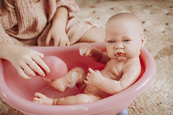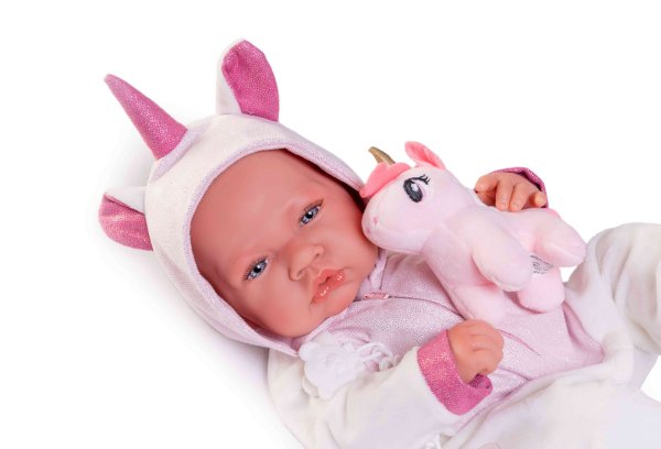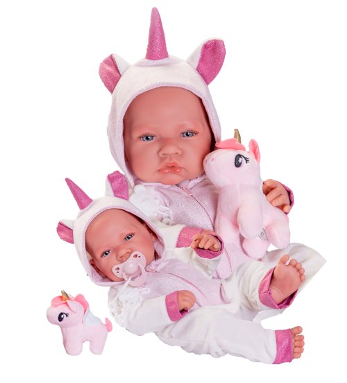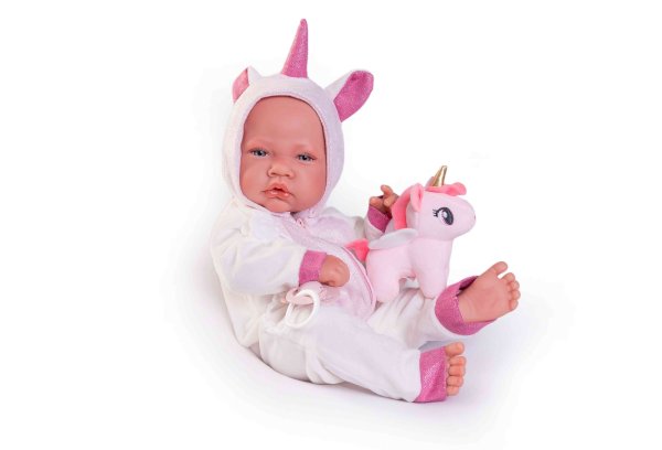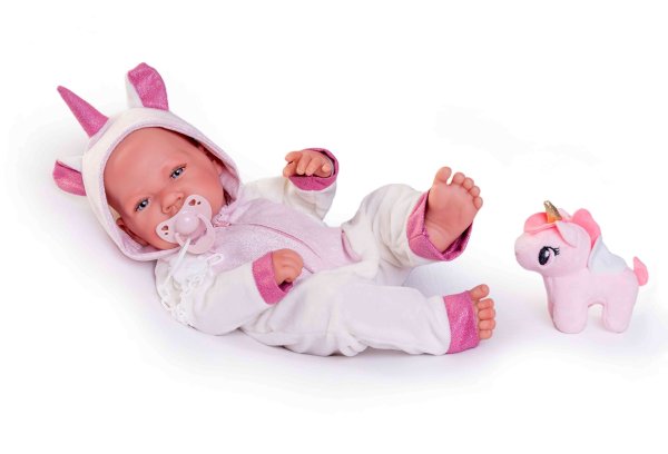 Ručne vyrobená realistická španielska bábika - bábätko new born s celovinylovým telom a realistickým vyobrazením rôznych bábätkovských faldíkov a detailov vrátane pohlavia. Bábika je vyrobená zo špeciálneho mäkčeného vinylu, veľmi príjemného na dotyk. Bábätko sa dá kúpať, ale je potrebné dať pozor, aby sa nenamočili riasy. Odlepené riasy nie sú potom dôvodom na reklamáciu. Oblečenie niektorých bábik bolo vyrobené z organickej bavlny, ktorá zaručuje výrobu z ručne zbieranej, ekologicky bez chemického ošetrenia pestovanej bavlny. Firma Antonio Juan kladie veľký dôraz na ekológiu a preto ako prvá využíva v tomto odvetví spomínanú bavlnu. Veľkosť 42 cm. Balené v darčekovej krabici. Odporúčaný vek od 3 rokov.