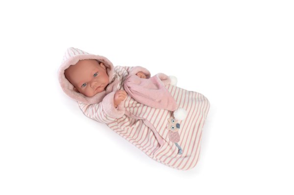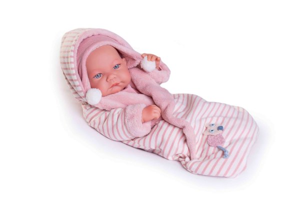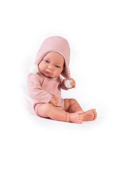 Ručne vyrobená realistická španielska bábika - bábätko new born s celovinylovým telom a realistickým vyobrazením rôznych bábätkovských faldíkov a detailov vrátane pohlavia. Bábika je vyrobená zo špeciálneho mäkčeného vinylu, veľmi príjemného na dotyk. Bábätko sa dá kúpať, ale je potrebné dať pozor, aby sa nenamočili riasy. Odlepené riasy nie sú potom dôvodom na reklamáciu. Oblečenie tejto bábiky bolo vyrobené z organickej bavlny, ktorá zaručuje výrobu z ručne zbieranej, ekologicky bez chemického ošetrenia pestovanej bavlny. Firma Antonio Juan kladie veľký dôraz na ekológiu a preto ako prvá využíva v tomto odvetví spomínanú bavlnu. Veľkosť 42 cm. Balené v darčekovej krabici. Odporúčaný vek od 3 rokov.