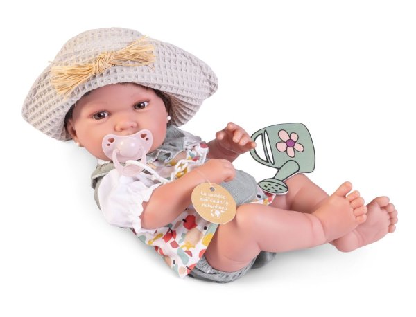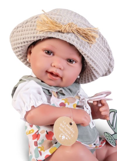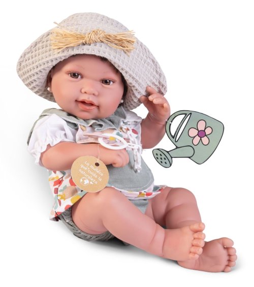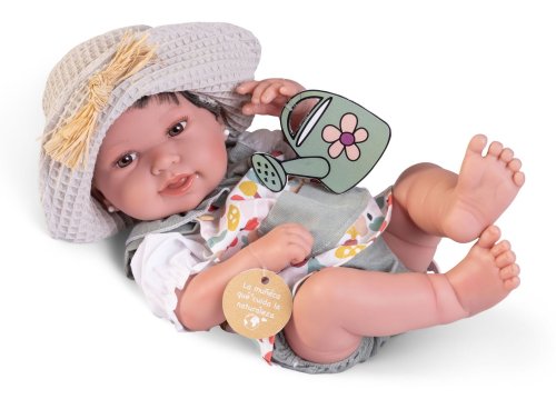 Ručne vyrobená realistická španielska bábika - bábätko new born s celovinylovým telom a realistickým vyobrazením rôznych bábätkovských faldíkov a detailov vrátane pohlavia. Bábika je vyrobená zo špeciálneho mäkčeného vinylu, veľmi príjemného na dotyk. Oblečenie niektorých bábik bolo vyrobené z organickej bavlny, ktorá zaručuje výrobu z ručne zbieranej, ekologicky bez chemického ošetrenia pestovanej bavlny. Firma Antonio Juan kladie veľký dôraz na ekológiu a preto ako prvá využíva v tomto odvetví spomínanú bavlnu. Veľkosť 42 cm. Balené v darčekovej krabici. Odporúčaný vek od 3 rokov.