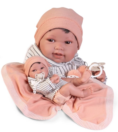 Ručne vyrobená realistická španielska bábika - bábätko new born s celovinylovým telom a realistickým vyobrazením rôznych bábätkovských faldíkov a detailov vrátane pohlavia. Bábika je vyrobená zo špeciálneho mäkčeného vinylu, veľmi príjemného na dotyk. Oblečenie niektorých bábik bolo vyrobené z organickej bavlny, ktorá zaručuje výrobu z ručne zbieranej, ekologicky bez chemického ošetrenia pestovanej bavlny. Firma Antonio Juan kladie veľký dôraz na ekológiu a preto ako prvá využíva v tomto odvetví spomínanú bavlnu. Veľkosť 42 cm. Balené v darčekovej krabici. Odporúčaný vek od 3 rokov.