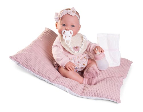 Žmurkajúca a cikajúca, ručne vyrobená realistická španielska bábika - bábätko new born s celovinylovým telom a realistickým vyobrazením rôznych bábätkovských faldíkov a detailov vrátane pohlavia. Bábika je vyrobená zo špeciálneho mäkčeného vinylu, veľmi príjemného na dotyk. Oblečenie niektorých bábik bolo vyrobené z organickej bavlny, ktorá zaručuje výrobu z ručne zbieranej, ekologicky bez chemického ošetrenia pestovanej bavlny. Firma Antonio Juan kladie veľký dôraz na ekológiu a preto ako prvá využíva v tomto odvetví spomínanú bavlnu. Veľkosť 42 cm. Súčasťou balenia je aj fľaštička plniteľná vodou a dve jednorazové plienky. Balené v darčekovej krabici. Odporúčaný vek od 3 rokov.