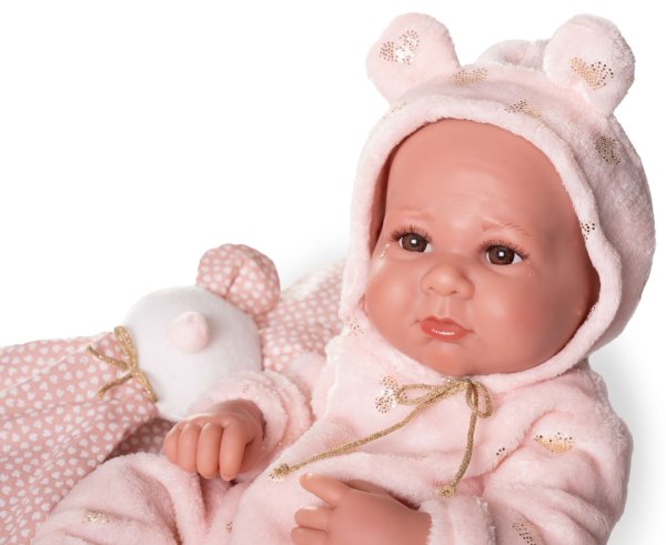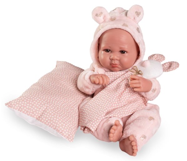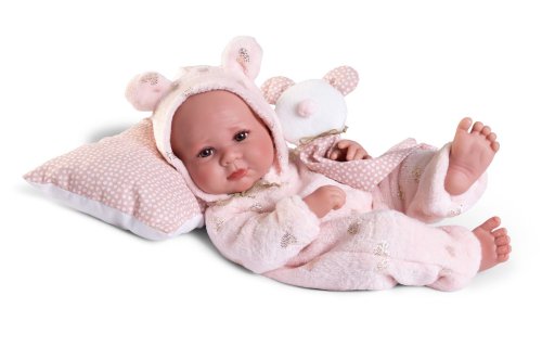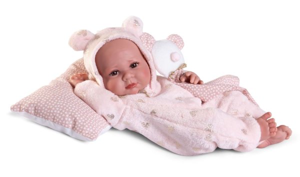 Ručne vyrobená realistická španielska bábika - bábätko new born s celovinylovým telom a realistickým vyobrazením rôznych bábätkovských faldíkov a detailov vrátane pohlavia. Bábika je vyrobená zo špeciálneho mäkčeného vinylu, veľmi príjemného na dotyk. Bábätko sa dá kúpať, ale je potrebné dať pozor, aby sa nenamočili riasy. Odlepené riasy nie sú potom dôvodom na reklamáciu. Oblečenie niektorých bábik bolo vyrobené z organickej bavlny, ktorá zaručuje výrobu z ručne zbieranej, ekologicky bez chemického ošetrenia pestovanej bavlny. Firma Antonio Juan kladie veľký dôraz na ekológiu a preto ako prvá využíva v tomto odvetví spomínanú bavlnu. Veľkosť 42 cm. Balené v darčekovej krabici. Odporúčaný vek od 3 rokov.