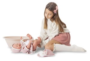 Mrkací a cikajúci, ručne vyrobená realistická španielska bábika - bábätko new born s celovinylovým telom a realistickým vyobrazením rôznych bábätkovských faldíkov a detailov vrátane pohlavia. Bábika je vyrobená zo špeciálneho mäkčeného vinylu, veľmi príjemného na dotyk. Oblečenie niektorých bábik bolo vyrobené z organickej bavlny, ktorá zaručuje výrobu z ručne zbieranej, ekologicky bez chemického ošetrenia pestovanej bavlny. Firma Antonio Juan kladie veľký dôraz na ekológiu a preto ako prvá využíva v tomto odvetví spomínanú bavlnu. Veľkosť 42 cm. Súčasťou balenia je aj fľaštička plniteľná vodou, dve jednorazové plienky a vanička. Balené v darčekovej krabici. Odporúčaný vek od 3 rokov.