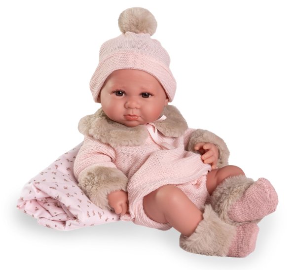 Ručne vyrobená realistická španielska bábika - bábätko new born s celovinylovým telom a realistickým vyobrazením rôznych bábätkovských faldíkov a detailov vrátane pohlavia. Bábika je vyrobená zo špeciálneho mäkčeného vinylu, veľmi príjemného na dotyk. Bábätko sa dá kúpať, ale je potrebné dať pozor, aby sa nenamočili riasy. Odlepené riasy nie sú potom dôvodom na reklamáciu. Oblečenie niektorých bábik bolo vyrobené z organickej bavlny, ktorá zaručuje výrobu z ručne zbieranej, ekologicky bez chemického ošetrenia pestovanej bavlny. Firma Antonio Juan kladie veľký dôraz na ekológiu a preto ako prvá využíva v tomto odvetví spomínanú bavlnu. Veľkosť 42 cm. Balené v darčekovej krabici. Odporúčaný vek od 3 rokov.
