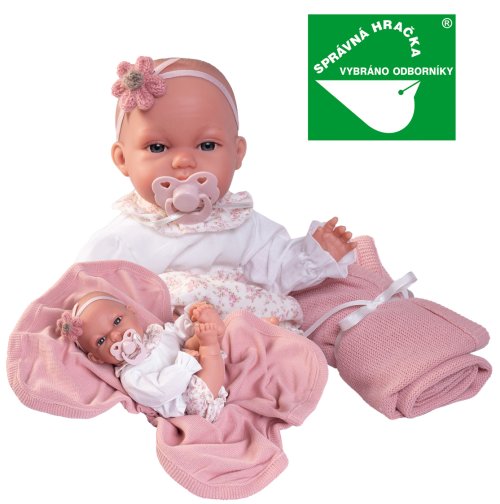 Ručne vyrobená realistická španielska bábika - bábätko, so špeciálnou pohybovou funkciou. Vďaka vnútornej opore kostry tela, môže robiť neobvyklé pohyby končatín, ako prekrížiť nožičky v ľahu, dať k sebe dlane alebo zaujať rôzne bábätkovské polohy. Bábätko má mäkké látkové telo, hlava a končatiny sú vyrobené z kvalitného mäkčeného vinylu. Oblečenie niektorých bábik bolo vyrobené z organickej bavlny, ktorá zaručuje výrobu z ručne zbieranej, ekologicky bez chemického ošetrenia pestovanej bavlny. Firma Antonio Juan kladie veľký dôraz na ekológiu a preto ako prvá využíva v tomto odvetví spomínanú bavlnu. Veľkosť 34 cm. Balené v darčekovej krabici. Odporúčaný vek od 3 rokov.